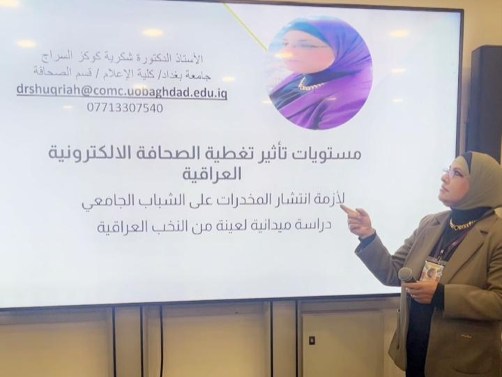 Dr. Al-Siraj presented a research paper titled “The Impact of Iraqi Online Press Coverage of the Drug Crisis on University Youth.” The study was based on a sample of 400 participants, including academics, media professionals, security personnel, and religious figures.
